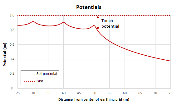 The touch voltage is the difference between the ground potential rise (GPR) of the earthed objects (including the earthing grid) and local soil potential, as presented in the figure below.