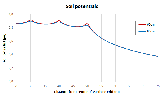 This effect is valid for earthing grids that are in the typical ranges of depth, as mentioned above, up to 1 meter. The effect shown in the figures is based on calculations in software using a uniform soil model. For multi layer models where the lower layers have lower resistivity values the effect is even stronger. In case a multi layer model is used with the lower layer(s) of higher resistivity values, the presented effects will not be applicable. And finally it is also important to mention that we consider the short circuit current not to change due to the (slightly) lower earthing resistance.
