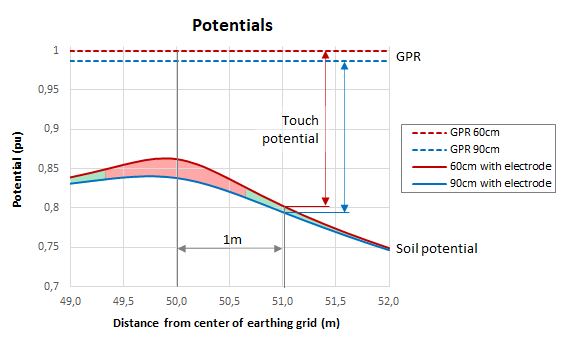 An increase of the depth will cause the soil potentials to go down, as can be seen in the figure below. This means that the touch voltages should go up, but this is only true when the GPR remains the same. And this is not the case. An increase of the depth of an earthing grid results in a decrease of the GPR. Remember that the GPR is determined by the current that flows into the ground, with ‘far earth’ as a reference. This means that the ‘parallel path’ for the current through earth is larger, resulting in a lower earthing resistance of the earthing grid.